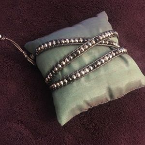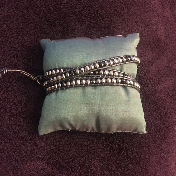 Grayish leather with silver beads Wrap around wrist Button close
