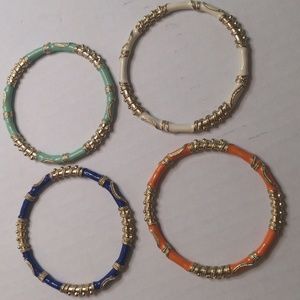 4 bracelets not connected; 1 orange/gold, 1 blue/gold, 1 white/gold & 1 sea green/ gold