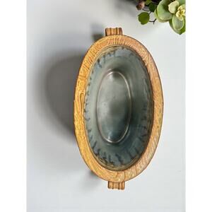 Handcrafted studio pottery vessel by Brad Tucker, a North Carolina ceramic artist known for his richly textured, architectural forms and layered glazes. Standing 7" tall, 8.25" long, and 4.5" wide, this striking oval-shaped basket vase features a woven, grid-like surface design accented by earthy brown and amber tones cascading into shades of sky blue. The dual side handles add sculptural detail and reflect Tucker’s signature blend of rustic craftsmanship and modern design. Created in Seagrove, NC—an area with a storied pottery heritage dating back to the 18th century—this piece exemplifies the region’s contemporary interpretation of traditional hand-thrown work. Artist-signed “BT” on the base. A beautiful accent for art pottery collectors or rustic contemporary interiors.