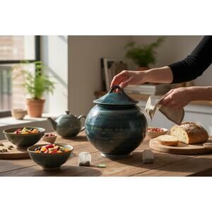 Handmade lidded vessel by studio potter Brad Tucker. Wheel-thrown stoneware with a pulled loop finial lid, round storage jar form, and a raised foot. The glaze is deep ocean blue with ash-like drips giving it a smoky, atmospheric look that fits modern rustic, wabi-sabi, coastal, and artisan interiors. The impressed potter’s mark appears near the base. Size approx. 8.5" tall x 7.25" wide. Tucker is part of the late 20th / early 21st century American studio pottery movement, which emphasized small-batch craft over mass production and brought functional ceramics back into everyday homes. Made in North Carolina. Stoneware body is sturdy and meant to be used or displayed as sculpture.