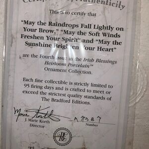 The "Bradford Edition Irish Blessings Heirloom Porcelain Ornaments" 4th edition is a set of 3 oval-shaped porcelain ornaments featuring colorful designs. These hanging ornaments are suitable for all occasions and are part of a collection. They are designed for adults and make a great addition to any ornament collection.