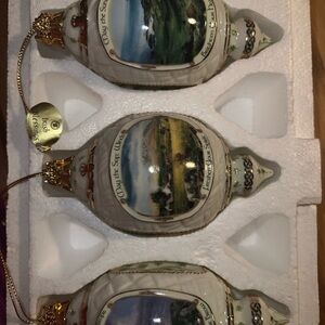 Elegant holiday ornaments featuring scenic designs. Perfect for adding a touch of charm to your festive decor.