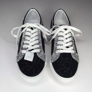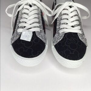 The stitched black canvas uppers showcase adorable, officially licensed Disney art - Mickey Mouse on one shoe and Minnie Mouse on the other - against a pattern of their silhouettes. But what really sets these sneakers apart is the silvery Ever-Sparkle trim that will have your feet glittering for years to come! A red glittery Mickey Mouse head charm and soft rubber soles complete the design.