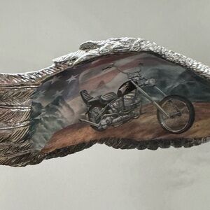 Description: This striking collectible features a bald eagle figurine with detailed silver-toned feathers. The wings showcase vibrant imagery, including motorcycles and the American flag, symbolizing themes of freedom and the open road.