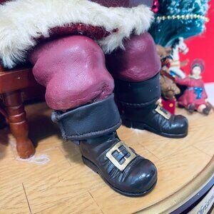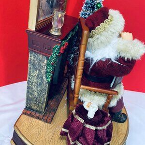 Santa is sitting on a wooden chair in front of the fireplace. Above him is a Thomas Kinkade recreation of "Cobblestone Christmas". The light above the painting comes on, and the fiber-optic tree cycles through different colors. You can choose to have the lights always on/off, and to add the narrator reading "Twas the Night Before Christmas". There is a volume switch. Operates on (3) AA batteries or an adapter (neither is included). 12.5" tall, 9" deep, 11" wide.