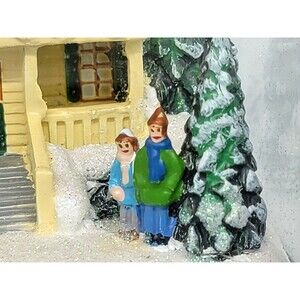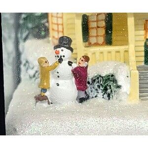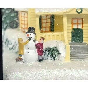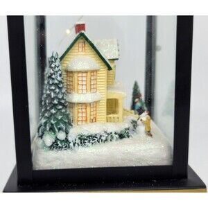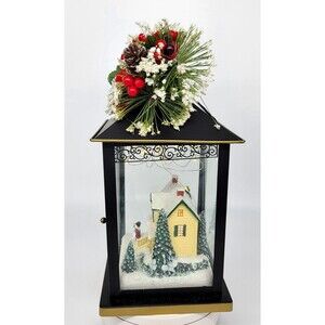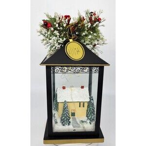 Celebrate the magic of the season with this enchanting Thomas Kinkade "Believe" Lantern from The Bradford Exchange. Featuring a beautifully detailed winter scene inspired by the beloved "Painter of Light," this decorative lantern captures the warmth and charm of a classic holiday homecoming. Inside the glass panels, a snow-covered Victorian-style home is warmly lit and surrounded by evergreen trees and joyful figures, including children building a snowman. The scene is accented with glistening "snow" and soft LED lighting, creating a cozy and nostalgic holiday ambiance. The top of the lantern is adorned with a stunning Christmas floral arrangement, complete with pinecones, red berries, white frosted accents, and a bold red velvet bow with gold trim. The roof of the lantern is inscribed with the word "Believe" in elegant script a gentle reminder of the wonder of the season. Please note that the lantern is new in box but there is a slight scratch on the top of black part of the lantern (please see last photo).