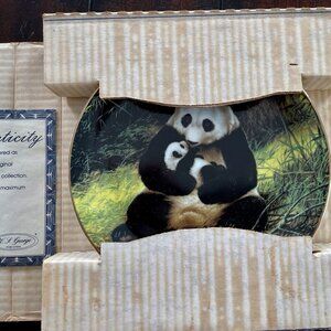 Features adult female Panda cuddling her cub with thickets of bamboo in the background. Gold plated trim.