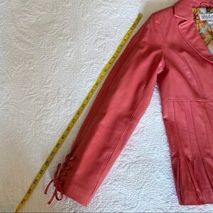Statement leather jacket color style silhouette flattering ruffle lace up detail v -neckline cute details must have leather jacket Barbie
