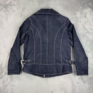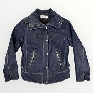 Bradley Bayou Women's Motorcycle Leather Jacket Navy Blue with Contrast Stitching and Removable Fleece Vest Lining.