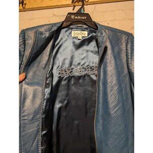 Style:. Fitted blue leather jacket. Designer name embroidered on the luxurious trimmed satin interior