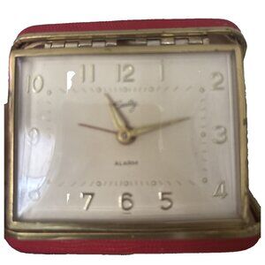 This vintage Bradley Hand wind-up travel alarm clock features a square shape with a red case and gold display. Made in Japan, this mechanical clock with regular numerals and is a functional and collectible piece that showcases a retro style. The alarm clock is a great addition to any vintage clock collection, especially for those who appreciate the nostalgic charm of traditional timekeeping methods.