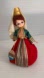 Charming vintage doll wearing a red and green dress with gold accents. Features a striped pattern and a cream headscarf.
