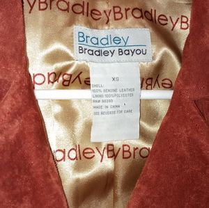 This is a beautiful, burnt orange/burgundy color. The leather has a suede finish. Comfortably fits XS to S.