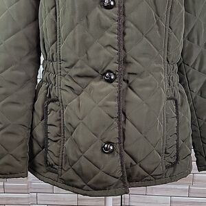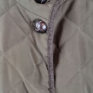 A polyester outer quilted shell with a polyester cotton blend fill in a lovely olive green color. Fitted with large gathers at the waist, two hand pockets and chunky buttons round out the look. Great pre-owned condition