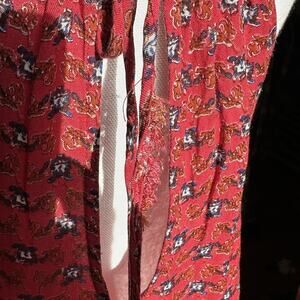 Braeve Bohemian Sleeveless Dress. Thin shoulder straps. Keyhole with a self tie in the back. Ruffle bottom hemline. Great gently worn condition. One tie has some fraying, see photo.