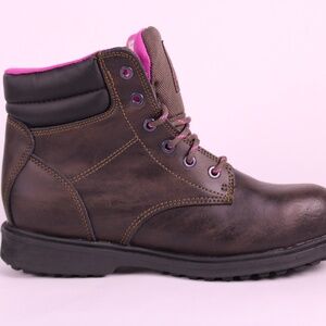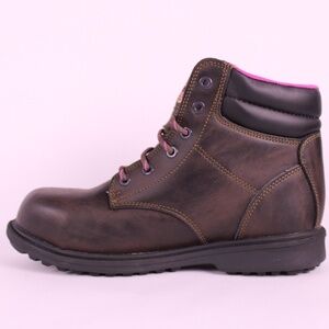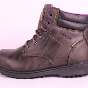 Stay protected and comfortable on the job with these Brahma steel toe work boots in women’s size 8.5. Made with a durable leather upper and waterproof design, these boots feature a pink interior lining and purple-accented laces for a touch of style. ASTM F2413-18 rated with a strong steel toe for safety.