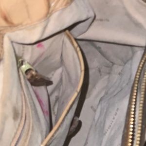 Excellent condition genuine leather. There is a lipstick smudge on the inner pocket aside from that the interior is in perfect condition. No signs of wear on the outside.