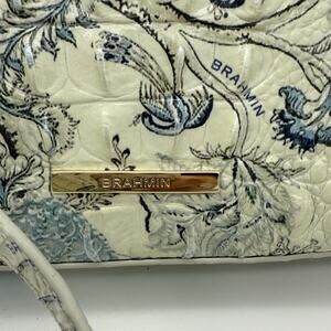 Elevate your style with this stunning Brahmin Amelia Crossbody Bag. The beautiful blue botanical design is sure to turn heads wherever you go. Crocodile Embossed, textured leather.