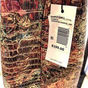 This is an incredibly beautiful bucket bag. The front of the bag is pictured twice, photo #1 is in one light and photo #2 is in a different light. I did this to show the nuance of the same bag in different lights. The color is HTF and the style, Amelia, has been retired for quite a while. It's NWT, sold as a sample. This lovely bag is made of genuine croc embossed leather, has a snap closure, featuring a center zip pocket, a smaller zip pocket on one side, a slide pocket on the other side, pen pocket and key clip. NWT, dust bag, top handle and shoulder strap. Dimensions: 9" length, 11" height, depth 5.5".