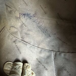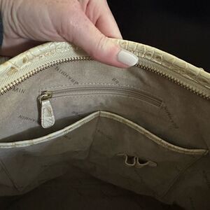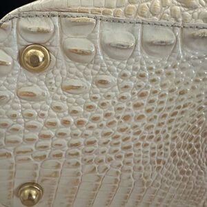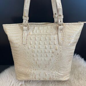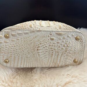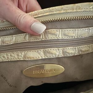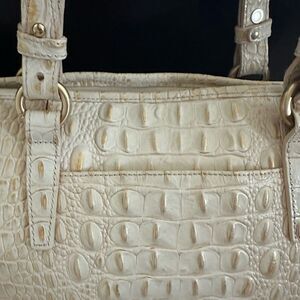 Beautiful Brahmin Bag in excellent condition! Very minimal signs of wear on outside. Creamy ivory finished with a shimmery gold that gives an irresistible glow. Includes dust bag. Some pen marks at bottom of interior lining. Handle in good shape. Very slight cracking at top of handle when bag is handled the most. Slight cracking at one bottom corner. Please see all images.