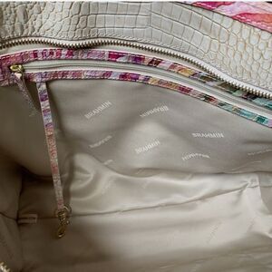 This Brahmin Ashlee Ombré Entice Melbourne Bag Leather Tote Purse stylish tote bag features a vibrant multicolor design on a cream crocodile-embossed background. Perfect for adding a pop of color to any outfit.