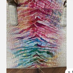 This Brahmin Ashlee Ombré Entice Melbourne Bag Leather Tote Purse stylish tote bag features a vibrant multicolor design on a cream crocodile-embossed background. Perfect for adding a pop of color to any outfit.