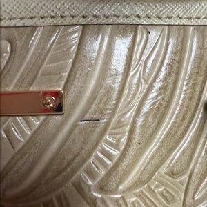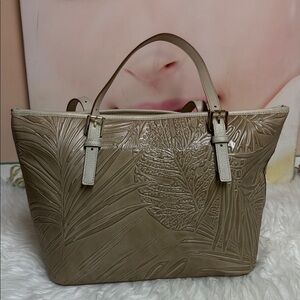Stylish beige tote bag with embossed leaf design. Features dual handles and a decorative charm. Please photos for references. Has a small ink stains as pictured. Measures approximately 15.5x10x5 inches. Strap drop is approximately 10 inches.