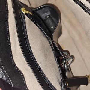 Elegant shoulder bag with a sleek black front. Rich brown woven sides. Gold-tone hardware accent. Super cute! Great, gently used condition!