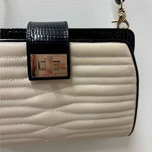 Authentic. Length 9”. Depth 6.25”. Chic crossbody bag with quilted cream front. Black croc embossed and gold hardware. Detachable strap. Wear as clutch or purse. Crossover turn lock closure. Back slip pocket. Front compartment with 8 card slots and 2 cash compartments. Main compartment with zip closure. Interior zip pocket and key lanyard. Striped lining. Perfect for versatile styling. Some interior markings. Otherwise great condition.