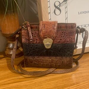 Chic crossbody with crocodile texture. Rich brown and black design. Ideal for versatile styling.