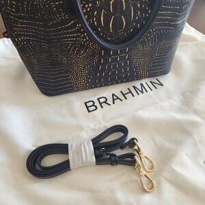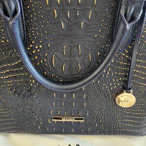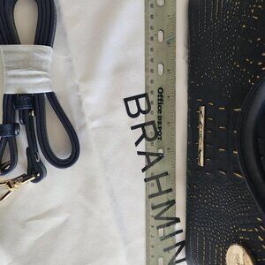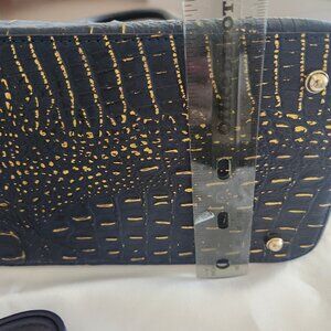 Beautiful navy & gold Brahmin purse. Gently and rarely used. I never used the shoulder strap. It's 11" long, almost 10" high and about 4-1/2" wide on bottom. The ruler is in the picture, but it's hard to see.