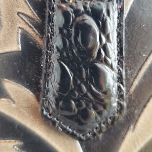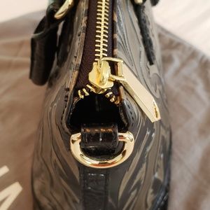 The Brahmin Mirage Embossed Duxbury 00028 Black and Taupe with Melbourne Croc Leather Base and Handles. The Zip Top Satchel has 4 Gold Tone Feet.