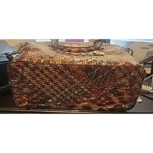 The Brahmin Large Duxbury Satchel in Melbourne is a stylish and spacious handbag designed for women. Made from leather with a fabric lining, this satchel features a unique animal print pattern in blue and gold accents. The bag has a zip closure, multicolor leather handles, and a detachable strap for added versatility. The exterior showcases a colorful design, making it a fashionable and practical choice for everyday use. Perfect for adding a touch of designer flair to any outfit.