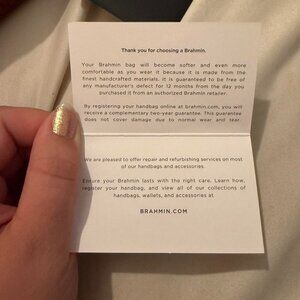 She is a Brahmin Lorelei Cherry Lacquer Melbourne shoulder bag. The tag that came with her says she is a Hillary, but I have Hillary and Lorelei in my closet, and she's a Lorelei. You get the registration card with her which has the care instructions and the wrong UPC sticker (doesn't matter, it's nice to have the black Brahmin envelope).