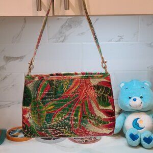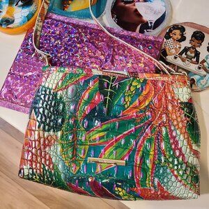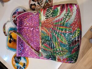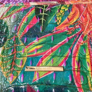 This is a lovely tropical print Brahmin Lorelei Utopia Melbourne shoulder bag NWOT. She is so sassy and fun! Bright colors for your resort vacation or summer beach trip! She zips up and has an interior zip pocket. This purse is big enough for your phone and essentials for those nights out. Take your shoes off on the yacht! \ The embossed crocodile/alligator raised parts are accented with shiny Magenta! I have not seen this on any other Brahmin bags. #magenta #glam #tropical #resort #vacation #summer #beach #pool #shoulderbag #likeaclutch #utopia #Brahmin #yacht #funvibes 10.5" drop strap Dust bag included