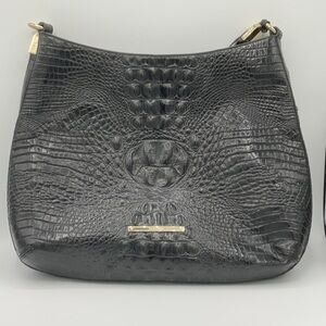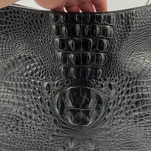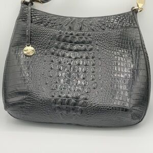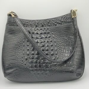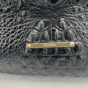 Fantastic large Black Melbourne Brahmin shoulder bag. Unique with the gold hinge that attaches the strap. Large graduated shape (see rough measurements below). Inside offers key strap, large zippered pocket, 2 slide in pouches great for phone or sunglasses and slide in pouch pen holder. Outside back has large slide in pouch area.