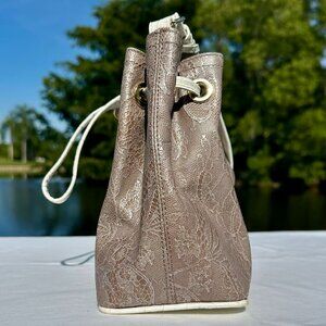 Brahmin Melinda Drawstring Floral Lace Bucket Bag Taupe Gray White Crossbody