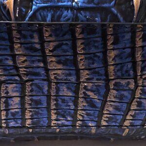 This beautiful genuine leather crossbody in the Lazuli color is extremely hard to find/discontinued. The Lazuli part describes a deep blue color with gold metallic highlighting. It features rolled top handles, gold tone hardware and a zip top closure; the exterior back has a slide pocket. Inside features a slide pocket, zip pocket, pen pocket and a key clip. NWT, registration, shoulder strap and dust bag.