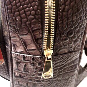 Beautiful croc-embossed genuine leather in a charcoal grey and brown hue. Features include adjustable shoulder straps, front zipper pocket, interior zip pocket, pen pocket, interior slide pocket and a dome zipped top. NWT, registration and dust bag.