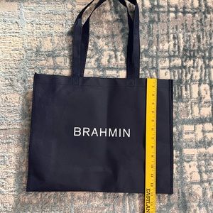 This Brahmin tote is specifically designed to be reused. It is a deep navy blue with the Brahmin name printed in white on both sides.