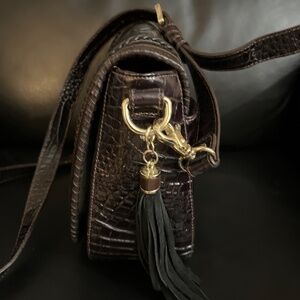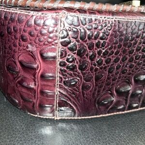Gorgeous deep brown beauty made by BRAHMIN and barely used. 10 inches wide, 9 inches high, 4 inches deep. Long adjustable shoulder strap 50 inches long and adjusts down to 40 1/2. I wear it at 44 3/4 inches. I haven’t seen anything like this in years, especially this size!