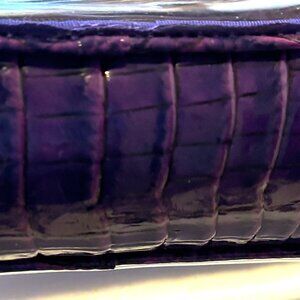 A great clear vinyl trimmed with classic Roal Purple that's great for travel and events requiring transparency. Made with genuine leather and features zip top closure, adjustable strap, back slide in pocket, front flap closure pocket, interior organizer pocket, interior zip wall and dust bag. Stadium approved, 25" strap drop. GUC