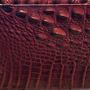 This beautiful genuine leather satchel is featured in a deep cranberry color with a tab closure, center divider pocket, removeable adjustable crossbody strap and a slide in pocket in back. The interior features an interior zip pocket, an organizer pocket, pen pocket and a key clip. Also included is the registration, unattached price tag, registration and dust bag.