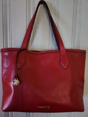 Authentic Brahmin - A Rare Fined! Elegant Smooth Leather Luxury Bag in Dark Pink (Raspberry) This large bag is perfect for everyday use. Features a Spacious interior with room for all your personal items. The exterior offers - one zippered pocket with 2 additional slip in pockets and an attached key ring holder. The exterior bag offers a back large slip in pocket for your phone. The long sturdy handles for comfortable shoulder carrying.
