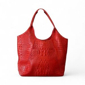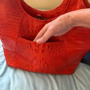 Never used, like new Brahmin tote bag! This bag has it all! It’s both beautiful and functional with one outside pocket on the back, 2 deep pockets on one side of the interior and a very large zipper pocket on the other interior side. A gold tone clip on top keeps the bag closed. The double straps are very comfortable to wear. Original Brahmin store bag is included.