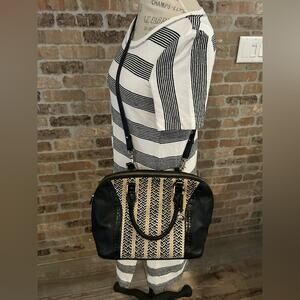 Brahmin Vivian Saint Tropez Black Leather Woven Straw Raffia Satchel Cream Med