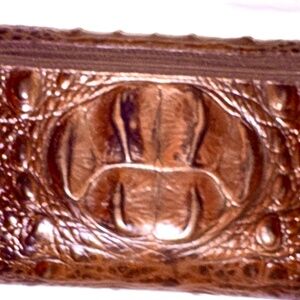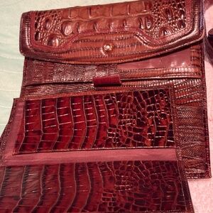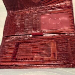 Beautiful rich Brahmin clutch and checkbook holder, holding 8 credit cards, two IDs, a wad of bills, checks and checkbook, seven cubbies, and a coin purse. It is in a rich brown color, deeply etched, with two heavy-duty snap closures. You could almost carry this as a purse rather than a wallet as it holds everything. You can even pull the checkbook holder out completely if you want to reduce the depth. 8” w, 4 1/2”h, 1”d. It is in almost perfect condition, EXCEPT some wear along the rim of the closure, which could be easily touched up.