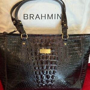 Luxurious Espresso colored Brahmin laptop tote, 17x10” (easily holds a 14x9” laptop). 100% real leather, crocodile pattern, four pockets inside, two with zippers. Handles work on arm or shoulder carrying. Like new, no visible wear. Compare with current new price of $395.