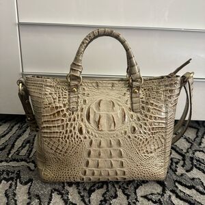 Elevate your style with the Brahmin tan crocodile embossed leather satchel. This elegant bag features a luxurious design perfect for any occasion.