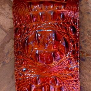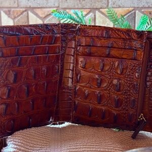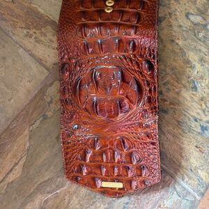 Brahmin wallet in rich Pecan color. This little guy holds everything….6 credit card slots plus change purse, ID window, billfold, plus three cubbies. Strong snap to shut. 5” W, 4” H, 1 “ D. I see no signs of wear or blemishes on it, except a little worn area on flap that folds. I haven’t tried to cover up this sign of wear, though it would be easy to do.